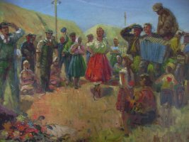 More about the artist: Olexander Savitj Yatsuk was born on the 22nd og February, 1920, in the village Demchiv, Berdichev region, Ukraine to a family of railway station workers. His childhood passed in a beautiful and picturesque surrounding that was to become the inspiration for his first paintings. Petro Omeljanovitch Dyak, teacher of art in the Berdichev art school, had a major influence on Olexander Yatsuk´s future life as an artist. After having finished the art school in 1938, he started to work as teacher of drawing and art in the village of Olshanka. Olexander Yatsuk was loved and respected by his students. In may 1940 Olexander Yatsuk was called up for military service in the Soviet Army. His service took place in the Caucasses region. Olexander Yatsuk´s wife, Klavdia Mihalovna, gave a birth to a son Vladimir in 1940. He could see his son first when the war was over in 1945. These long years of seperation from family had an influence on his art. He drew with pencil a many portraits portrates of his family: the wife, the child, mother, and father, and sent them from the front to his family in Vilshanka. After the war he was rewarded with medals and orders by the Soviet state for faithful service. In 1949 Olexander Yatsuk worked in the Culturel House of Vilshanka. Many of his postwar period paintings related to the Great Patriotic War. The birth of his daughter Olga in 1948, marked a new period of his creative work. From 1958 to 1980 he worked with other painters in the art union in the town of Zhitomir. Olexander Yatsuk took part in many local, regional and country exhibitions. He had lived and created his works in the time of socialist realism and confirmed himself as an artist with his own style and originality. The range of Olexander Yatsuk´s art is broad and multifold. He worked in historical, portrait, landscape and still-life genre. Olexander Yatsuk´s creative life was linked to Zhitomir region. He devoted his life and his energy to create the canvases which praised the beauty of his native land and people with whom he lived. Painting gave him a lot of pleasure and happiness. His life was filled optimism and love for people. Olexander Yatsuk passed away on 8th of October 1986. He left after himself a lot of wonderful heritage of art. Even though death took him away from us, he will always live in our hearts. His art will be carefuly kept and handed from generation to generation.